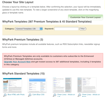 I don’t have a problem with these additional services costing more, but they even charge fees for use of any of their newer templates. They really want you to pay them at least $10 a month to upgrade your account. Right now they offer a small selection of “standard templates” and a much larger selection of premium templates. I don’t know what the premium templates look like, because I haven’t paid up. Their pitch: